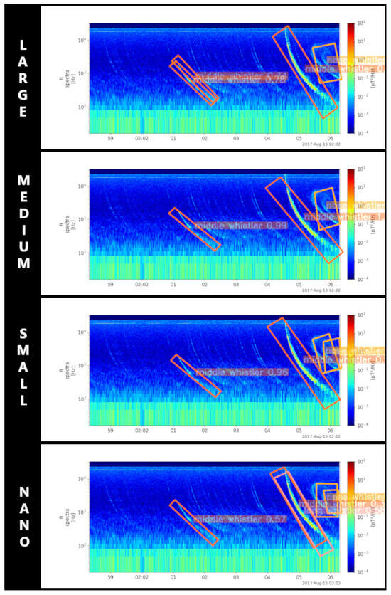Figure 4 illustrates how effectively the four models can detect four types of whistlers: short, long, middle, and nose whistlers. The red rectangles indicate the bounding box detections, accompanied by the type of whistler and the corresponding confidence scores. From this, we can observe two important points. First, the nano model performed well, comparable to the other models, detecting all types of whistlers and registering a similar number with confidence values above the threshold of 0.5.