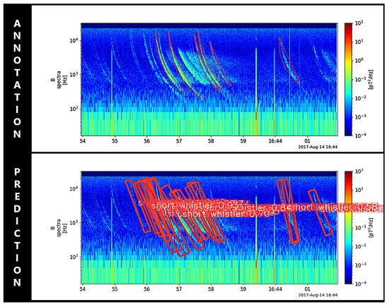 We show one of the examples of the unlabeled dataset in Figure 5. From the annotation image, we can see that not all whistlers are labeled. This is due to our limitations in manually labeling the entire dataset. However, testing results indicate that the model can successfully detect all whistlers, even those that are not labeled. This suggests that the model shows promise for application in automated detection, given that whistler events occur frequently at all times in the atmosphere. In the test results, we observe that this model is unable to detect certain low-intensity whistlers within the time range of 16:44:54 to 16:44:55 due to faint and discontinuous lines that do not meet the detection criteria. This limitation arises because we only labeled whistlers with clear shapes and higher intensities, specifically those above , based on our current spectrogram.