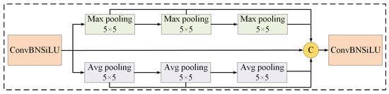 To enhance the detail representation capability of small objects, this section introduces a Mix-SPPF module that integrates an average pooling layer into the existing SPPF framework, as illustrated in Figure 2. In contrast with traditional Max pooling methods, which solely preserve max values within a local region, average pooling captures more comprehensive and nuanced feature information by considering all the elements within the pooling region. Moreover, the smoothing effect provided by average pooling effectively mitigates the effect of outliers on the results, thereby reducing the risk of overfitting. This enhancement enables the Mix-SPPF module to extract more refined and high-dimensional features without compromising computational efficiency, significantly enhancing the generalization capability of the model with respect to the input data.