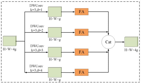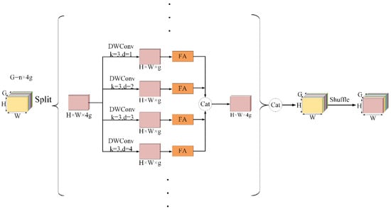 - The MSAF module is integrated into the ULSAM module to replace its single spatial attention mechanism. Additionally, to further enhance information flow, a lightweight intra-group multi-scale fusion attention module (IGMSFA) is introduced, as shown in Figure 7. Firstly, for the input feature map (where G = n × 4 g), it is uniformly divided into n groups along the channel dimension, with the number of channels in each group being 4 g, to obtain the following: