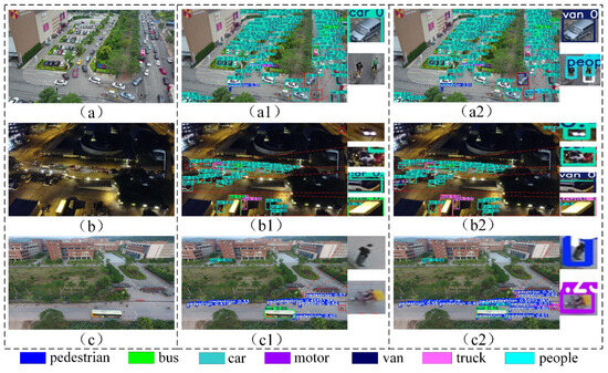 Detection results of YOLOv9s and IA-YOLOv8 on the Visdrone2019 test dataset. The figures in (a–c) illustrate the input images. The figures in (a1,b1,c1) present the detection results obtained using YOLOv9s. The figures in (a2,b2,c2) present the detection results obtained using IA-YOLOv8.