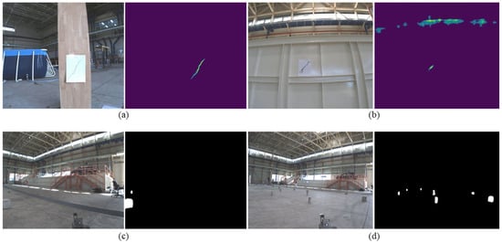 When the segmentation model is used alone, when taken from a close distance, the segmentation works well as shown in Figure 2a,c. However, as shown in Figure 2b,d, it can be confirmed that the segmentation is not properly performed when the image is taken from a long distance. In particular, the dark part of the background in Figure 2b was also mistakenly judged as a crack and segmented, and in Figure 2d, some objects could not be segmented.