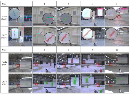 Figure 7 shows the original test set images of 1280 × 1024 in size and the results of detection and segmentation. InYD shows post-processed images of the results of YOLOv7 and Deeplabv2, and the overlapping part of the two results is displayed. The translucent gray box in InYD indicates the detection result of YOLOv7. When the two results are used together, the error of over-detection can be reduced compared to obtaining damage information using the two results separately. However, as the intersection of the two results is used, if object detection is omitted in either model, the result is discarded. As shown in the case of InYD, segmentation performance deteriorates when the object moves away, resulting in partial segmentation or missing objects. Looking at Case 4–10, YOLOv7 detects the cracks and piles, but Deeplabv2 does not segment them, so they are missing.
