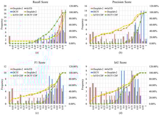 The difference in the method also affected the evaluation metric. Figure 8 shows the histograms of Recall, Precision, F1, and IoU for each model. It shows how each score is distributed in the score band. CDF means Cumulative Distribution Functions. In the case of Recall, the distribution of DCIY is not good, but it can be seen that all the other scores are distributed in a higher score range compared to other models.