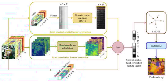 We designed a method for extracting SSBC features for HSI, and the proposed features fuse JSS features, original spectral bands, and BC features. In designing the SSBC features, we observed over-smoothing in the classification map and further explored the reasons for and solutions to this problem. To exploit the joint spectral–spatial information of a patch, we designed JSS features. The extraction of these features first transforms the 3D patch into a 2D image, and then the spectral and spatial information of this image is considered in a single efficient compression of the DCT. However, there is over-smoothing in the classification map yielded by JSS features. Unlike current methods, which consider this problem from the perspective of spatial information, we argue that insufficient spectral information in the extracted features is the reason for this problem. To increase the spectral information in the features, we designed BC features and used them with the original spectral bands as added spectral information. The SSBC features fused with more spectral information efficiently mitigate the over-smoothing problem in the classification map. In the classification phase, adaptive SMOTE was used to generate a balanced training set prior to classification, therefore avoiding the effect of the class imbalance problem on feature evaluation. LightGBM was used to quickly learn a classifier from the SSBC features. The details are described in Figure 1. The code used in this study is available at https://github.com/Lightness7/SSBC.git (accessed on 11 November 2024).