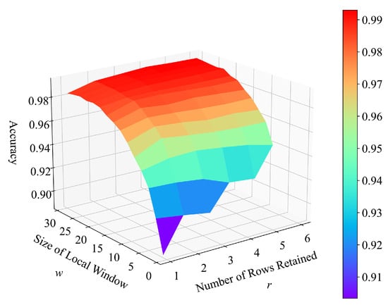 In this study, the optimal parameters were determined using the Indian Pines dataset. To demonstrate the generalizability and robustness of the proposed features, no parameters were changed when the classification results of the other datasets were obtained. For the extraction of the JSS features, the DCT compresses the joint spectral–spatial information of the patch of size , and the first r rows after compression are retained as the extracted features. In this experiment, 10% of the Indian Pines dataset was sampled for training using stratified random sampling to determine the optimal parameters, w and r. The parameter of w ranges from 1 to 29 in steps of 2. The parameter of r ranges from 1 to w if and ranges from 1 to 6 if in steps of 1. Figure 2 shows the parameter selection process in the form of a 3-D plot. The best accuracy of 99.36% was achieved with and , which was frozen and used for subsequent experiments.