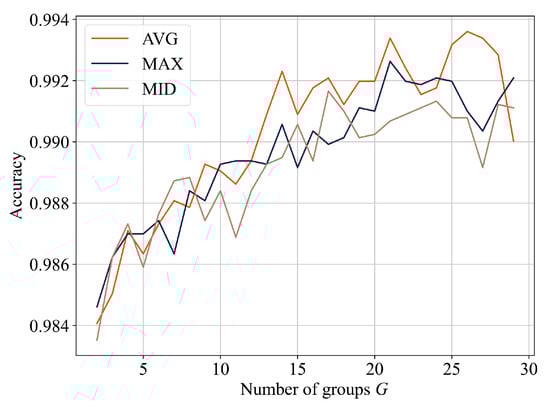 In addition, the classification accuracy of the three types of input matrices for the band-correlation calculation was compared for different numbers of groups. The three input matrices were the average value matrix (AVG), maximum value matrix (MAX), and middle matrix (MID) for the spectral bands in the groups. Figure 3 shows the optimal parameter selection of the input matrix and group G for the band-correlation calculation, and the best accuracy of 99.36% is achieved when the input is AVG and .