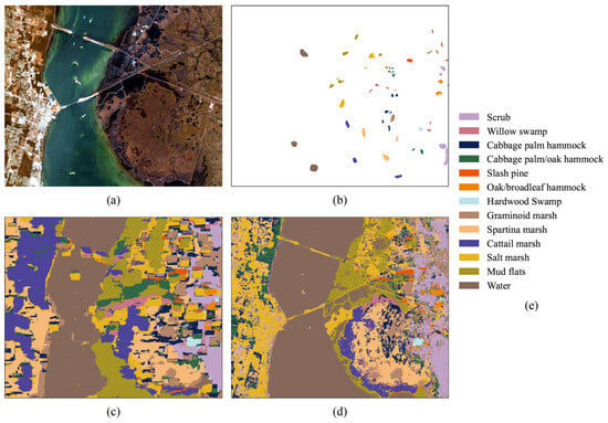 KSC dataset. (a) False-color image. (b) Ground truth. (c) Joint spectral–spatial (JSS) features. (d) Spectral–spatial-band-correlation (SSBC) features. (e) Legend.