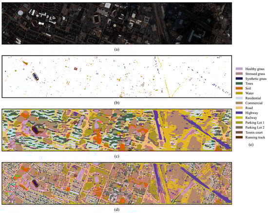 The Houston dataset is a image acquired over the University of Houston campus and its neighboring urban area, with a spatial resolution of 2.5 m. The sensor used was the Compact Airborne Spectrographic Imager (ITRES-CASI) 1500 with 144 bands ranging from 0.36 to 1.05 m. The available ground truth is designated into 15 classes of urban land covers with 15,029 labeled pixels, and Table 3 shows the number of training and test samples per class.