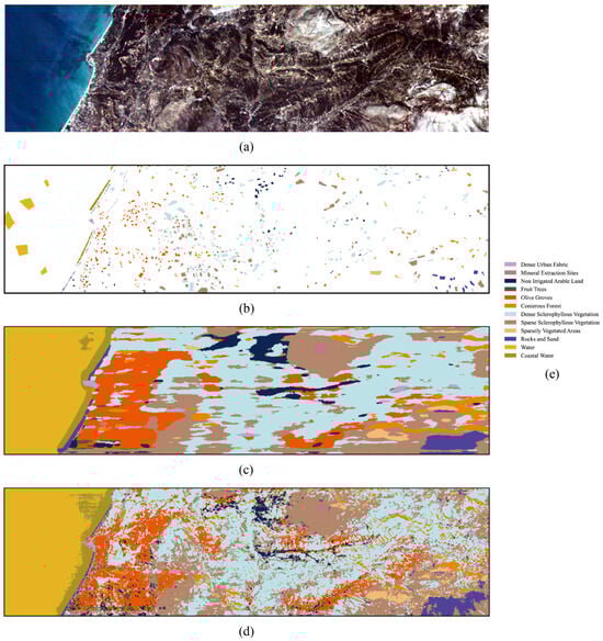 Loukia dataset. (a) False-color image. (b) Ground truth. (c) Joint spectral–spatial (JSS) features. (d) Spectral–spatial-band-correlation (SSBC) features. (e) Legend.