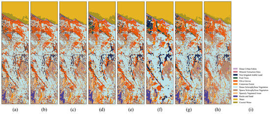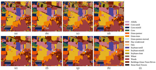 Indian Pines dataset. (a) SSAN. (b) SSAtt. (c) RSSAN. (d) K-ResNet. (e) SSSAN. (f) SSTN. (g) CVSSN. (h) SSBC. (i) Legend.