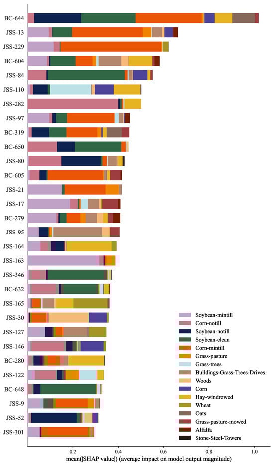 SHAP is a tool for machine-learning interpretability that calculates the SHAP value for each feature to explain the feature importance for a particular prediction, addressing the trade-off between the accuracy and interpretability in complex models [,]. TreeExplainer in SHAP can explain the contribution of features in tree models to the prediction results and was used to explain and visualize the contribution of the proposed features in the results of this study.