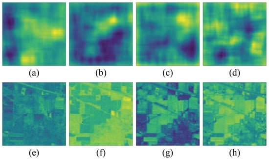 where Concat denotes the concatenation operation in the channel direction, and . The band-correlation feature of each pixel is a vector of length at the corresponding location in the band-correlation matrix C. This method maintains the simplicity and fast calculation of the NDVI and IO, which is used to generate more spectral information to address the over-smoothing problem.
