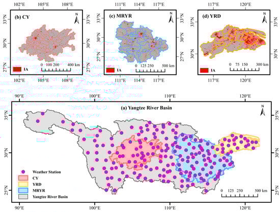 The Yangtze River, one of the world’s largest rivers, is prone to flooding due to its distinct rainy seasons. The river basin includes the CY, MRYR, and YDR urban agglomerations []. The CY, located in southwestern China, encompasses the megacities of Chengdu and Chongqing, serving as the economic hub of Southwest China, with a total area of approximately 180,000 km2 and a population exceeding 90 million []. The MRYR, situated in Hubei Province, lies at the confluence of the Yangtze and Han Rivers, covering an area of about 100,000 km2 with a population of over 60 million, connecting China’s eastern coastal regions with inland areas []. The YRD, located in eastern coastal China, includes City of Shanghai and parts of Jiangsu and Zhejiang provinces, spanning around 210,000 km2 and housing a population of more than 150 million, making it a globally important economic zone []. The impermeable areas of these three urban agglomerations in 2020 are shown in Figure 1. While these areas are located at different positions along the Yangtze River, they are all threatened by floods from the Yangtze River and its tributaries. Collectively, these three urban agglomerations faced economic losses of over CNY 500 billion due to flooding events in recent decades [].