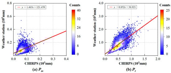PBIAS (Equation (2)) assesses the aggregate statistical bias between the two data sources. Daily precipitation comparisons were focused on precipitation thresholds greater than 0.1 mm/day during the flood season.