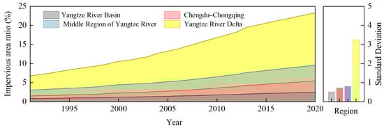 We examined changes in imperviousness throughout the urbanization process. Imperviousness is a critical indicator reflecting the extent of land covered by buildings, roads, and other infrastructure. Impervious surfaces typically prevent rainwater from infiltrating the soil, which increase surface runoff and, consequently, the risk of flooding.