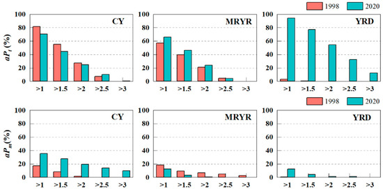 In the MRYR, aPt was nearly the same in both years, but aPm was higher in 1998. Both flood indices were higher in 1998 than in 2020, reflecting the severity of the 1998 flood. In the YRD, both aPt and aPm were significantly lower in 1998 compared to 2020. However, the flood indices were higher in 1998, suggesting that despite heavier rainfall in 2020, improved flood response capabilities reduced the impact.