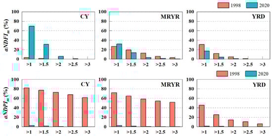 The classification of high-risk flood areas was based on the different sensitivities of the NDFI and NDPI indicators. Pixels with an aNDFIm greater than 3 and an aNDPIm above 5 were classified as high-risk flood areas. Table 2 presents the statistics of high-risk flood areas across the three major urban agglomerations. Each value in the table represents the number of pixels within each region that exceeded the defined thresholds. During the flood season of 1998, the MRYR of the Yangtze River had a relatively higher number of high-risk flood areas under both the NDFI and NDPI indicators. This was particularly true under the NDPI indicator. The number of high-risk flood areas significantly exceeded those of the CY and YRD. This indicates that the MRYR suffered more severe flood disasters in that year.