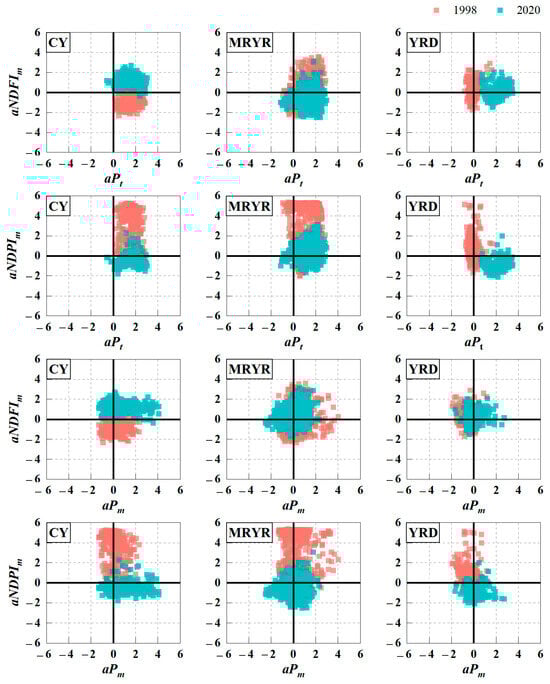 Figure 6 presents a scatter plot of aNDFIm and aNDPIm values against aPm and aPt values. These are for the CY, MRYR, and YRD in 1998 and 2020.