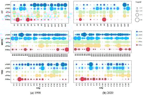 The relationships between the flood indices, precipitation indices, and imperviousness rates in 1998 and 2020 for the urban agglomerations in the Yangtze River Basin are displayed in Figure 7; the horizontal axis represents the cities and the vertical axis shows the normalized values of the imperviousness rate (IMRm), aPm, aPt, aNDFIm, and aNDPIm. A1–A16 correspond to the 16 cities of the CY. B1–B31 represents the 31 cities of the MRYR. C1–C19 comprises the 19 cities of the YRD. Each bubble represents a specific city, and the larger the bubble, the higher the value of the normalized indices.