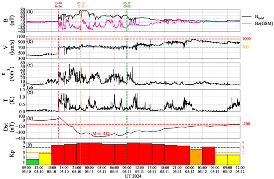 - Pierrard, V.; Winant, A.; Botek, E.; Péters de Bonhome, M. The Mother’s Day Solar Storm of 11 May 2024 and Its Effect on Earth’s Radiation Belts. Universe 2024, 10, 391. [Google Scholar] [CrossRef]