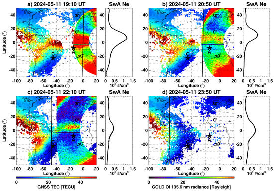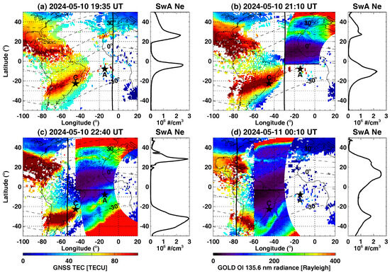 (a–d) Combined maps of GNSS TEC and GOLD nighttime OI 135.6 nm emission radiance (when available) over the American–Atlantic longitude sector at four times between 19:35 UT on 10 May and 00:10 UT on 11 May, overlapping with Swarm A satellite orbits. The geomagnetic latitudes with 15° interval are marked by dashed lines. The stars mark the digisonde locations of Ascension island (A) and Cachoeira Paulista (C). The right sub-panels show the corresponding latitudinal profiles of ionospheric electron density along the Swarm A path.