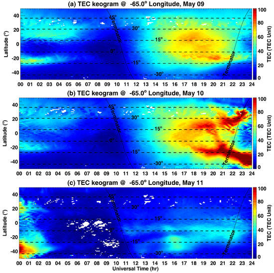 TEC keogram as a function of universal time and latitude along 65°W longitude on (a) 9 May, (b) 10 May, and (c) 11 May 2024, respectively. The terminator and geomagnetic latitudes with 15° intervals are marked.
