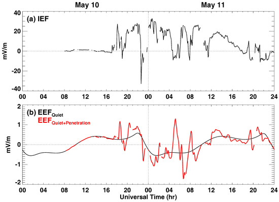 Temporal variations in (a) interplanetary electric field (IEF) and (b) equatorial electric field (EEF) over 60°W for quiet-time (black) and quiet-time plus penetration (red) on 10–11 May 2024.