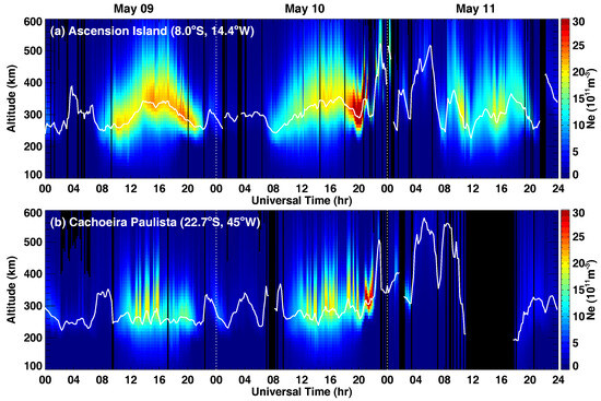 To further demonstrate the influence of PPEF on the low-latitude and equatorial ionosphere, Figure 7 shows digisonde measurements of electron density profile and F2 layer peak height (hmF2) at Ascension island and Cachoeira Paulista on 9–11 May 2024, respectively. The electron density profiles in the bottom-side ionosphere are retrieved in terms of shifted Chebyshev polynomials with a logarithmic argument containing the starting plasma frequency and the critical frequency of the layer, and the topside ionospheric electron density results are derived using an alpha-Chapman function of plasma density distribution [46]. Both stations are located in the lower mid-latitude ionosphere at approximately −15∼−20° MLAT. During the magnetic quiet-time on 9 May, the hmF2 at both stations showed a normal pre-reversal enhancement during 22:00–24:00 UT, characterized by a moderate post-sunset rise that reached altitudes of 320–340 km. However, during the main phase of the storm, the ionospheric electron density exhibited a drastic enhancement around 20:00–21:00 UT on 10 May, indicating that levels of local electron density were significantly influenced by the expansion of EIA crests. In the subsequent hours from 21:00 to 00:00 UT, the ionospheric hmF2 at both stations exhibited an extraordinary post-sunset rise from around 300 km to more than 500 km, while the ionospheric electron density profiles showed a notable depletion during this period. This drastic enhancement in hmF2 and coinciding substantial reduction in electron density indicates that these two stations were overwhelmed by the deep equatorial trough associated with the super-fountain effect. During this period, the EIA crests had shifted to the further poleward side of these two stations, which is consistent with the observations presented in Figure 2. These findings further support the role of PPEF in driving considerable ionospheric uplift and ambipolar diffusion within the equatorial and low-latitude ionosphere, ultimately leading to the observed poleward expansion of the EIA crests.