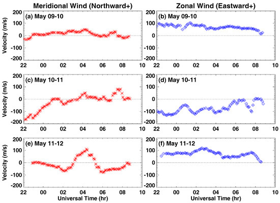 In addition to the composition changes effect, several studies have suggested that the merging of EIA crests can be triggered by localized downward E × B drift driven by westward electric fields due to wind disturbances [27,28,29,31]. Storm-time changes in the global neutral wind patterns and the influence of the Coriolis force typically lead to equator-ward and westward wind surges, which contribute to the building-up of DDEF with a westward polarity during the daytime through local dusk. The westward electric fields can diminish or even reverse the upward plasma drift in the equatorial region, thereby suppressing the ambipolar diffusion and contributing to the formation of single-peak EIA morphology [13,32]. For instance, Figure 7a shows that the daytime hmF2 during 12:00–18:00 UT on 11 May was generally lower than those observed at the same times during quiet conditions on 9 May, which suggests the likely influence of westward DDEF. However, Figure 8e shows that the magnitude of meridional winds at the mid-latitude station was quite small between 22:00 UT and 01:00 UT on 11–12 May, and Figure 8f shows that zonal winds were predominantly eastward during this period. These observations imply that the disturbance dynamo might have subsided by the end of 11 May. Given the lack of daytime neutral winds measurements and equatorial electric field data, assessing the relative contribution of DDEF and composition change effect remains a challenging issue. Future theoretical simulations are necessary to further elucidate their respective importance.