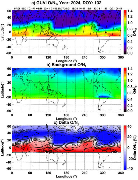(a) Map of O/N2 column ratio measured by TIMED/GUVI on 11 May 2024. Black lines show the satellite orbits, with the corresponding times labeled. (b) Quiet-time O/N2 map as the background reference. (c) Delta O/N2 map.