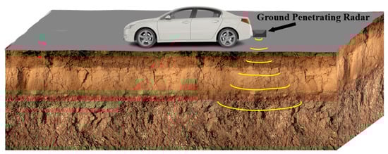 GPR is a non-invasive technology that utilizes electromagnetic waves to detect underground targets. By analyzing variations in reflection time and intensity, the structure of underground targets and the properties of the medium can be determined []. The detection process is illustrated in Figure 1. As an efficient subsurface exploration technique, GPR can rapidly and accurately detect underground targets without the need for surface contact. This technology has found widespread application in areas such as road maintenance, geological surveys, and battlefield demining [,,]. Recently, researchers have initiated studies on using GPR to assist with vehicle localization [].