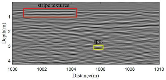 The underground structural features of the road are represented in GPR B-scan images as alternating bright and dark stripe textures, as shown in the red box in Figure 3, These stripes are horizontally distributed across the image. Additionally, higher-intensity spots appear on each stripe, as indicated by the yellow box in Figure 3. The effective extraction of these features for location is the primary focus of this paper.