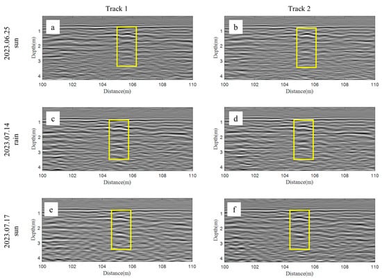 These spots are typically circular or elliptical in shape, with pixel intensities that are similar within the spot but distinct from the surrounding neighborhood. The spots generally correspond one-to-one with underground structures and exhibit a degree of stability over time and space. To verify the stability of GPR image features under varying environmental conditions, six datasets were collected along the same road on three different days: 25 June 2023, 14 July 2023, and 17 July 2023. The dates 25 June 2023 and 17 July 2023 were sunny days, while 14 July 2023 was rainy. As shown in Figure 4, two datasets were collected each time along the same trajectory, labeled Track 1 and Track 2. This is evident in the yellow boxes in Figure 4, where similar underground features are observed across all datasets. A comparison of datasets a, b, e, and f reveals that even after a 20-day interval, the underground structural images remain largely unchanged and stable, thus meeting the requirements for positioning. Similar underground features can be observed in the two GPR images from datasets c and d, although the similarity has decreased. This is because rainfall altered the dielectric properties of the soil, which weakened the signal’s penetration ability. However, the underground features are still measurable.