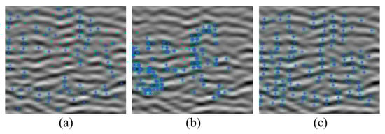 Comparison of feature point extraction results. (a) The SITF algorithm was used to extract feature points in GPR images. (b) The ORB algorithm was used to extract feature points in GPR images. (c) The SURF algorithm was used to extract feature points in GPR images.