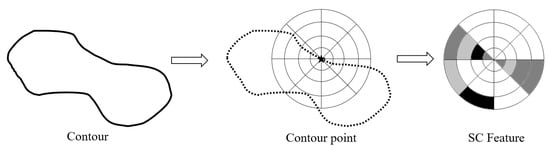 Shape context can describe arbitrary shapes and is widely used in contour matching, as shown in Figure 7. The contour line is uniformly sampled to obtain a set of contour points. For any given point in the contour point set, a polar coordinate system is established centered on that point. The number of contour points falling into small regions around that point is then counted. This process is repeated until each point in the contour point set has been accounted for, resulting in the SC feature.