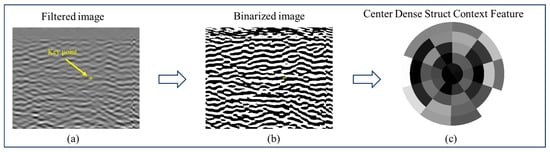 The steps of CDSC feature extraction. Descriptors are obtained by leveraging the stripes in the binarized image surrounding the pseudo-corner points. Subgraph (a) is the filtered image, subgraph (b) is the Binarized image, and subgraph (c) is the Center Dense Struct Context Feature.