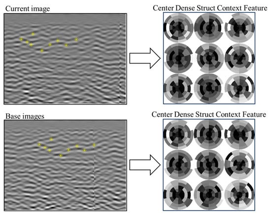 In summary, most existing GPR image matching algorithms are direct adaptations of visual image matching algorithms. Due to the low resolution of GPR images and the absence of well-defined geometric features, conventional image feature extraction methods are inadequate for effectively describing GPR image characteristics, leading to unsatisfactory matching results. GPR images commonly exhibit strip-like structures, which represent abstract representations of actual underground formations. These features are not only largely invariant over time but also distinct across different locations, making them ideal for matching. Shape context, a descriptor used to capture the outlines of shapes, is not constrained by the specific form of the target and can accurately reflect the distribution of sampled points along a contour. This method has been widely applied in object recognition and image matching [,,].