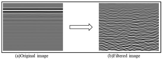 Comparison of GPR images before and after preprocessing; (a) displays the original output image, (b) shows the filtered image.