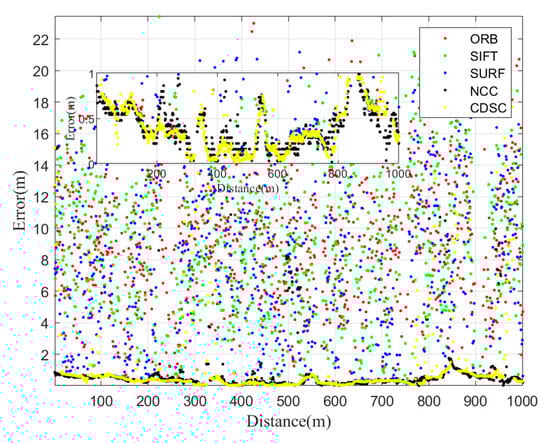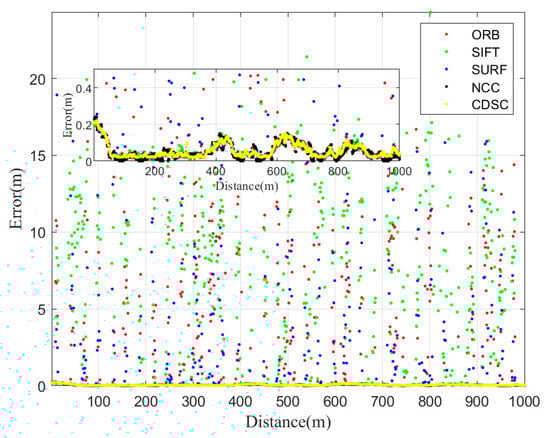 The proposed method was compared with SIFT, ORB, SURF, and NCC image matching methods in terms of localization accuracy and computational efficiency. The localization scatter plots are shown in Figure 14, where red, green, blue, black, and yellow represent the localization results of SIFT, ORB, SURF, NCC, and CDSC, respectively. The ORB, SIFT, and SURF descriptors showed a large number of mismatches, with maximum errors exceeding 20 m. In contrast, the localization results of CDSC and NCC were largely consistent, with localization errors of less than 1 m. The NCC algorithm, which uses a full matching approach by leveraging all intensity information in the GPR images, ensured high localization accuracy. However, the proposed CDSC algorithm, which derives its features from stable structures in GPR images, also guaranteed high localization accuracy.