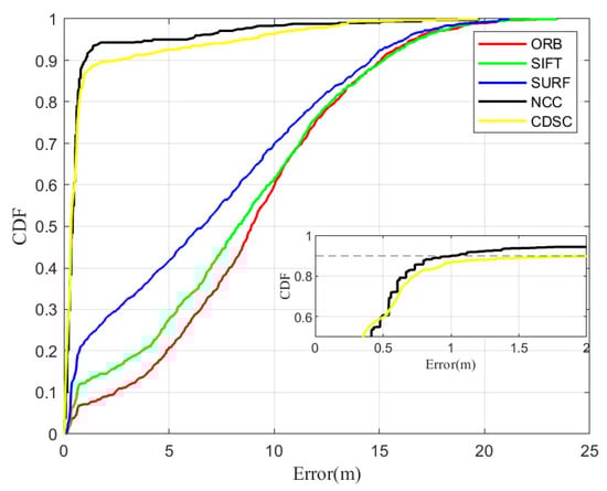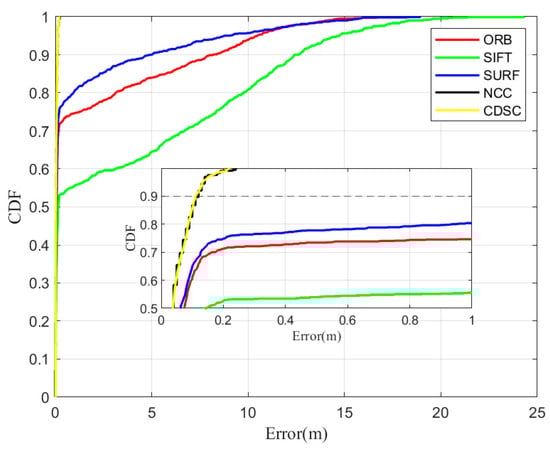 A statistical analysis of the localization error produced a cumulative probability distribution (CDF), as shown in Figure 16. The SIFT algorithm achieved 55.5% of the results within 1 m accuracy, ORB achieved 74.6%, SURF achieved 80.4%, NCC achieved 86.8% within 0.1 m, and CDSC achieved 85.6% within 0.1 m; CDSC and NCC have comparable performance.