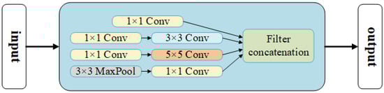 To harness input variables for CNN training that encapsulates the correlation between precipitations from low-resolution and high-resolution model outputs, a selection of variables—including precipitation (Prec), temperature (Tem), total water vapor (Vap), and sea level pressure (LP)—is performed. These variables are then integrated into a three-dimensional tensor, serving as the input for the CNN model. This way of stacking variables has been tried and tested in other downscaling methods [26]. This approach of amalgamating climatic variables into distinct input channels is a technique observed in other downscaling research endeavors. However, diverging from their methodology, we employ the convolutional module as the foundational component due to its capacity to offer varying receptive fields across different layers [36]. We integrate kernel sizes of 1 × 1, 3 × 3, and 5 × 5 (as shown in Figure 2) within our convolutional module assembly, aiming to mitigate the complexity of capturing the interplay between low- and high-resolution simulation outputs, particularly when precipitation manifests at disparate locales across the two datasets.