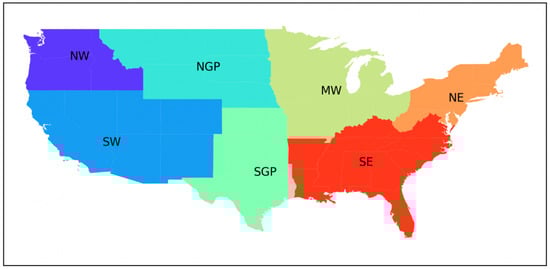 where N signifies the aggregate count of grid cells within the research locale. The variables and correspond to the precipitation levels within grid cell as rendered by the WRF model at high and low resolutions. In this scenario, serves as the Ground Truth. The notation denotes the deep neural network, characterized by parameters , which is employed to replicate the interplay between simulations of varying resolutions. According to the NCA, CONUS can be divided into seven subregions: Northeast (NE), Southeast (SE), Midwest (MW), Southwest (SW), Northwest (NW), Northern Great Plains (NGP), and Southern Great Plains (SGP). The specific division of regions is shown in Figure 5. As shown in Figure 6 (bottom right), we computed MSEs for the entire CONUS and the seven distinct subregions as delineated by the National Climate Assessment (NCA) [40].