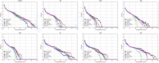 To affirm that STTA has adeptly captured the precipitation data’s distribution, we conducted an assessment of the Ground Truth across the full expanse of CONUS and its seven subregions, as well as PDF of precipitation for the other five forecasting models at each time step (shown in Figure 7). For a specific region, we consider all grid cells and time steps of the density function. In the distribution of light precipitation density, the disparity between the Ground Truth and the forecast model’s PDF value is not considerable. Ground Truth generally has a longer tail than Interpolator and SRCNN, while Direct-CNN and Encoded-CNN generally have a longer tail than Ground Truth. The distribution of SRCNN is basically consistent with that of Interpolator, and the density of heavy precipitation is smaller than the Ground Truth. Except for the Northern Great Plains, the distribution of STTA in other regions is the closest to the distribution of Ground Truth.