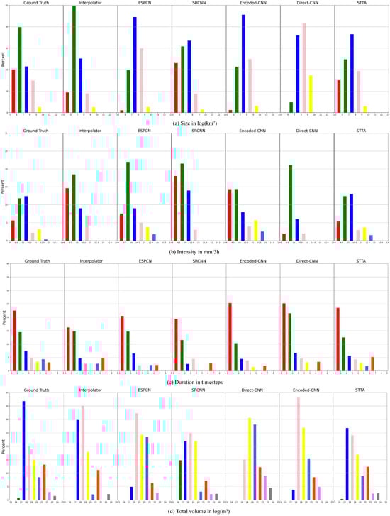 To appraise the efficacy of many models in replicating the intrinsic features of actual storms, we tracked and analyzed the life cycle of each model’s predicted storm to assess its average size, intensity, duration, and total precipitation. We categorize these features and count their frequency, the results of which are shown in Figure 8. From a precipitation intensity perspective, ground truth data show a significant precipitation event of more than 11 mm every 3 h. Although the Interpolator and SRCNN models failed to capture this phenomenon, the ESPCN, Encoded-CNN, and STTA models were able to successfully simulate it. This finding reaffirms the advantages of Transformer-based training methods for generating large amounts of precipitation, compared with Interpolator and current SRCNN models that more often generate weaker precipitation events and are underperforming at capturing these large amounts of precipitation events.