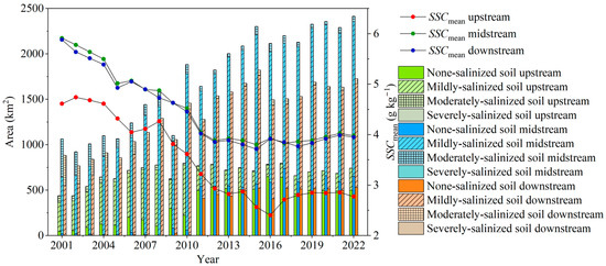 - The remote sensing inversion method accurately estimated root-zone SSC for various crops besides cotton, including wheat and maize, with an acceptable satisfactory R2 not less than 0.53. From 2001 to 2022, a basin-wide root-zone SSC was found to decrease 1.70 g kg−1, with a declining slow rate from 2011 or even a slight increase of 0.15 g kg−1 from 2017 to 2022 due to the adoption of FMDI technology, expanding farmland, and insufficient water supply.