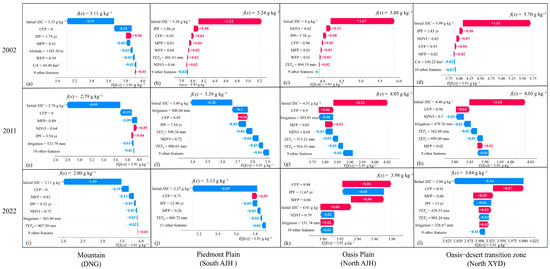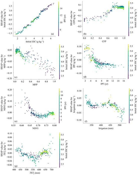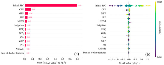 - The XGBoost model accurately predicted SSC dynamics, with R2 approaching 1 for the relationship between actual and predicted SSC values, and the SHAP-XGBoost model was effective in quantitatively interpreting the importance and contribution of different factors on predicted SSC. Among them, initial SSC, crop proportion (cotton and maize), implementation period of FMDI, NDVI, irrigation, and TETa were identified as the top seven factors influencing SSC variations. The analysis of SSC dynamics and their driving mechanisms revealed that reduced irrigation, caused by expanded cotton cultivation in the mid- and downstream regions, was the primary factor driving the recent increase in SSC. A simple scenario simulation showed that increasing irrigation per unit area and reducing cotton proportions in these regions could decrease SSC by up to 0.06 g kg−1. This emphasizes the importance of balancing cultivated area with water availability to reduce secondary salinization risks.