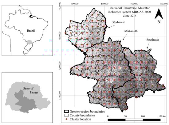 The NFI uses a systematic sampling design to allocate clusters across the country, following a regular grid of 20 × 20 km, meaning that each cluster represents a 400 km2 cell. Each NFI cluster covers an area of 4000 m2 and contains four 1000 m2 subunits arranged crosswise. Each subunit is further divided into 10 subplots of 100 m2, resulting in a total of 40 subplots per cluster []. Data were obtained from a sub-database of the Brazilian NFI, which includes nc = 152 clusters installed in the study area between February and May of 2013. Figure 1 shows the study area and locations of the clusters.