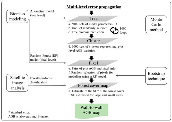 The forest attribute of interest is forest AGB (Mg ha−1), expressed as the sum of the AGB of woody trees, palms, and ferns. We predicted tree biomass, which was then summed to correspond to predicted plot-level (i.e., cluster-level) AGB per unit area. Next, plot-level AGB was used as the output variable for a pixel-level model. A forest cover map was produced to ultimately map AGB across the study area. This study assumes that the multi-level errors in the modeling and mapping processes are propagated to the final estimate. Figure 2 shows a flowchart of the analytical procedure outlined in this study.