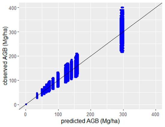 The random forest (RF) algorithm was used to (i) construct the pixel-level biomass model, (ii) select the most significant predictors (surface reflectance from OLI and vegetation indices), and (iii) predict pixel-level AGB in Mg ha−1. This nonparametric technique is robust to overfitting and generates multiple decision trees that serve as classifiers, each voting for the most popular class of the output variable []. The ‘randomForest’ package [] in R environment [] was used to implement the RF approach and then map the AGB (Mg ha−1).